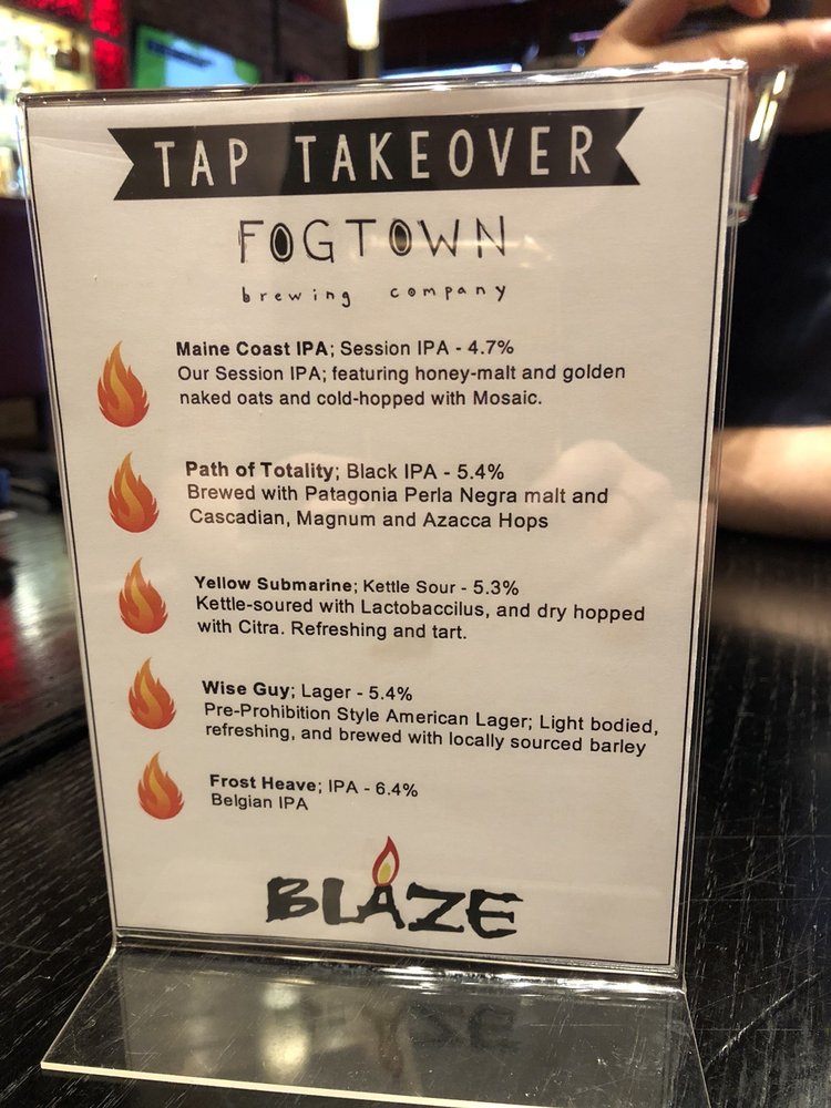 Blaze IPA battered haddock, tartar, Boston lettuce, tomato, onions, IPA pickles on a toasted brioche bun